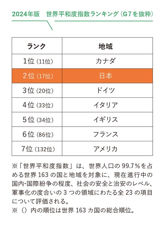 近年、世界的な分断化が進むなか、日本の「安全性」への関心が高まっています。経済平和研究所による2024年の世界平和度指数で日本はG7諸国中2位にランクインし、「社会の安全・治安」の分野でも7位と高い評価を受けています。こうした日本の特性は、新たな価値創造の可能性を秘めています。
