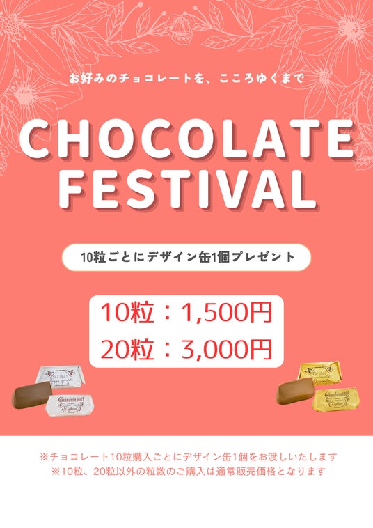 特典内容:お好きなチョコレート10粒 1,500円/チョコレート20粒 3,000円