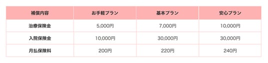 月額型は「お手軽プラン」「基本プラン」「安心プラン」の3種類で提供。期間選択型は1プラン(保険金額は月額型の安心プランと同等)。ユーザーのニーズに応じた幅広いプランを用意しています。