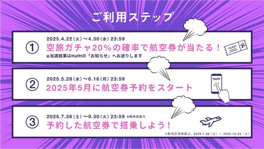 1.国内航空引換券をご当選された方には、2025年5月28日(水)頃に航空券手続きのご案内メールをお送りいたします。