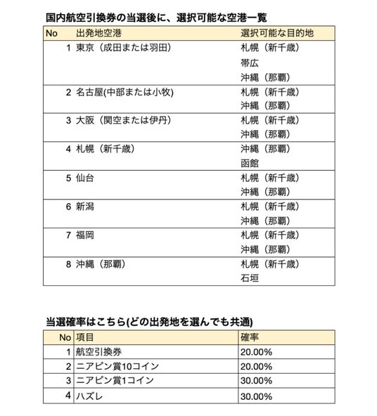 ・各種キャンペーンで獲得したガチャチケットを使用し、3回(区間)を超えて国内航空引換券に当選した場合、当選者自身が 最大3区間まで を選んで利用できます。よって、4回以上当選した場合でも、利用できるのは最大3区間までです。 それ以上の国内航空引換券の当選分は無効となります。