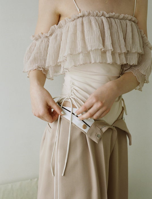 フリル部分は肩にかけても、オフショルダーでも着られる2WAY仕様で、サイドのドロストリボンが女性らしさをプラスしています。