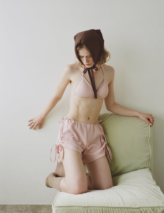 【ウエストリボン使いがフェミニンな、ビキニとショートパンツのセット】