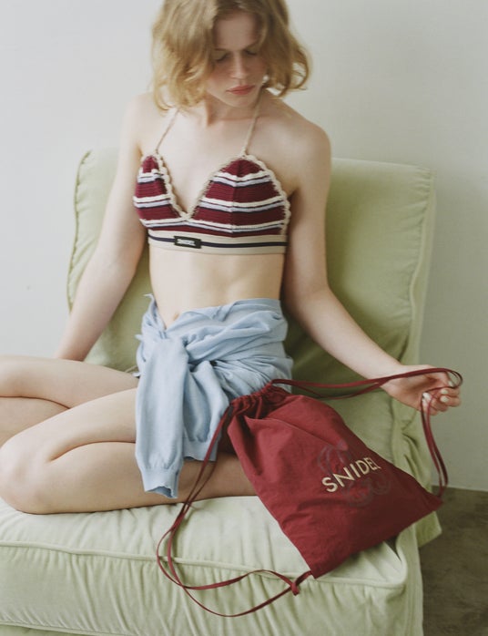 クロシェ編みのホルターネックビキニに、SNIDELロゴ入りナイロン巾着リュックが付いたセットアイテム。ビキニはパッド入り・ノンワイヤーで着心地よく、安心して着用できます。