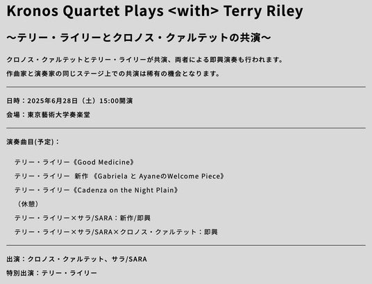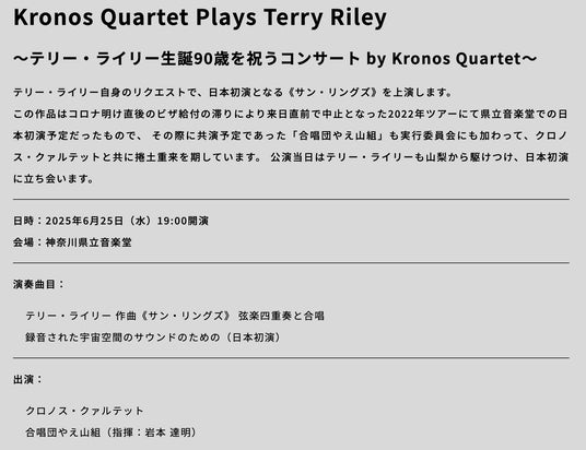 そして、クラウドファンディング終了に伴い、Terry Riley Kronos Quartet Matsuri2025の特設サイトが開設され、チケットの一般販売を5月14日(水)10:00より開始します。6月25日(水)は神奈川県立音楽堂で、6月28日(土)は東京藝術大学奏楽堂で公演が行われます。