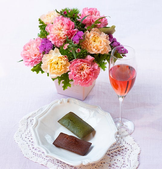 カーネーションをたっぷりあしらった、華やかなアレンジ「ルミナ」と贅沢なフィナンシェをセットでお届けします。