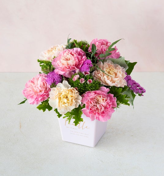 母の日アレンジのメインの花は、カーネーション「ミナミ」シリーズ。1輪の花の中に複数の色が集まり、おしゃれなミックスカラーのカーネーションたちです。