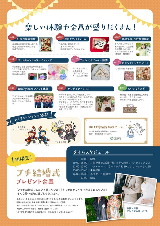 イベント当日は、子どもたちによる「ありがとうワークショップ」や感動の「ありがとう結婚式」、妊活支援ブース、文化体験ブースなど多彩なコンテンツが用意されています。さらに宇部市の観光資源や地元飲食店を楽しめる「やまぐち観光MAP」なども配布予定。地域の魅力を多面的に発信し、来場者にとって記憶に残る体験を提供します。