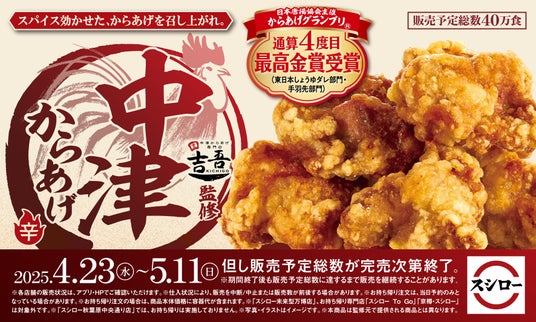株式会社あきんどスシロー(本社:大阪府吹田市、代表取締役社長:新居 耕平)は、からあげの聖地・大分県中津市に本店を構える、中津からあげ専門店「吉吾」監修の「中津からあげ」を4月23日(水)より全国のスシローにて期間限定で販売いたします。