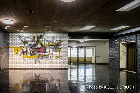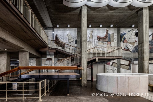 旧市庁舎内には村野氏と繋がりのあった彫刻家・辻晋堂氏の泰山タイルアート(タイトル「海・波・船」)が施されていますが、改装後はカフェの壁面としてそのまま使用します。また、村野氏は「手すりの名手」(*3)と評される程、階段の手すりのデザインにおいて豊かな表現をしていたと言われています。旧市庁舎内の市民広間で使用されていた大階段をホテルの吹き抜けに移設再現し、滑らかな曲線を含む手すりの一部も再活用します。