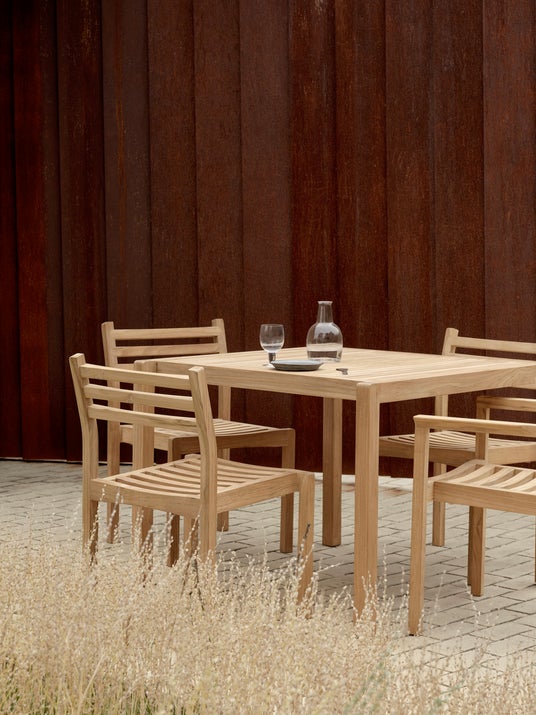 丸みを帯びたソフトなディテールとかっちりとしたラインのエレガントな組み合わせが個性的なデザインで、屋外空間にエレガンスと快適さをもたらします。FSC認証を受けたチーク材を使用し、時を経るごとに美しい経年変化を楽しむことができます。スタッキングして収納できるダイニングチェアは、機能性と美しいデザインの両立を目指しました。