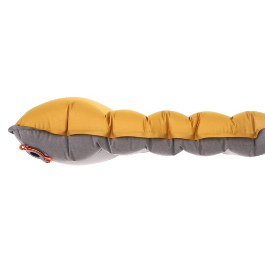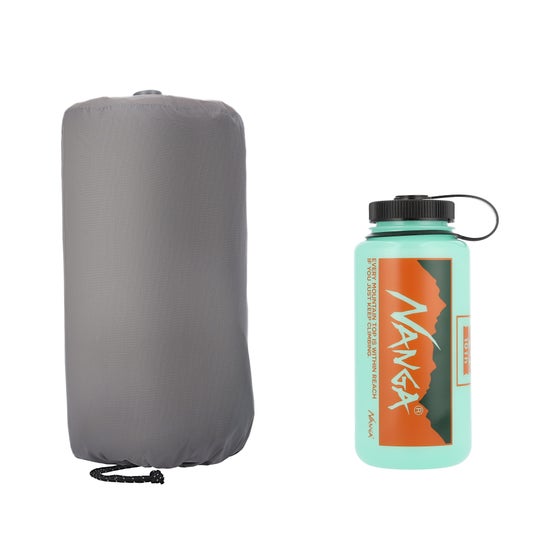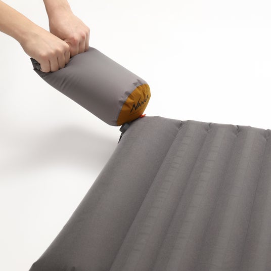 R値5.0の高断熱設計で、冬のキャンプや雪中泊にも対応。冷え込みやすい地面からの冷気を遮断し、快適な眠りをサポートします。落ち着いた印象のグレーカラーに、稜線モチーフの滑り止めを配置。収納袋はポンプとしても使える2WAY仕様です。