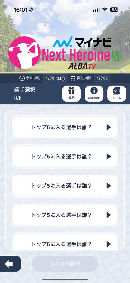 第3戦「Sanrio Smile Golf Tournament」に出場する全選手の中からトップ5に入る選手を予想し、さらにその中から優勝する選手を選んでいただく企画です。
