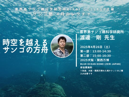 「100年後に残す」を理念に喜界島から最先端の研究・教育を世界に発信する「喜界島サンゴ礁科学研究所」は4月24日(木)~26(土)の3日間、2025大阪・関西万博 BLUE OCEAN DOME(ZERI JAPAN)にて2つの企画を発表いたします。