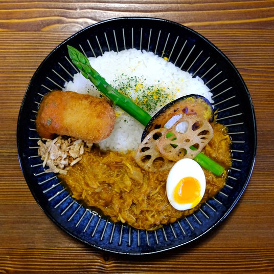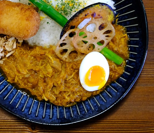 「無水チキンカレー」とは?水を一切使わず、鶏モモ肉と野菜の水分だけで数時間じっくり煮込んだカレー。肉も野菜も溶けソースと一体化した仕上がりです。