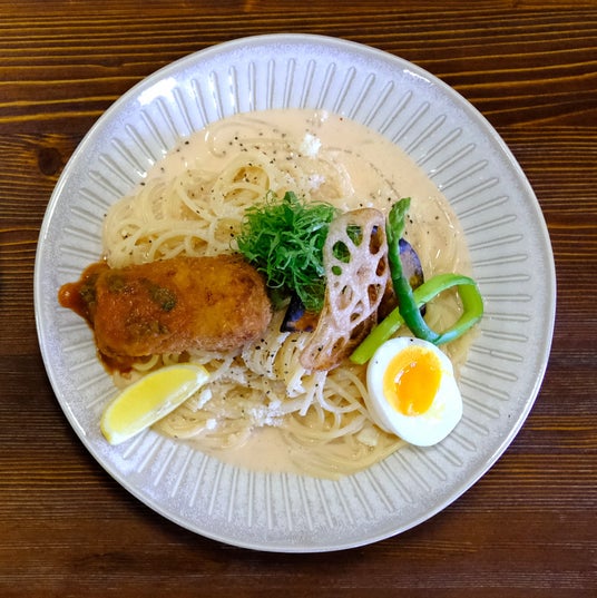 一押しは、2つの味が楽しめる「無水チキンカレーとパスタのhalf & half」のセットメニューですが、「無水チキンカレー」「本日のパスタ」のセットメニューも選べます。小鉢・サラダ・味噌汁どれも季節の野菜を味わえます。これからの季節は、磐梯町産のアスパラガス・春キャベツ・茎たち・サヤエンドウ・ほうれん草などを、サラダ・お浸し・グリルなどに使っていきます。パスタはその日により、ペペロンチーノ、たらこクリームなどでご用意。食後には甘さ控えめの白玉ぜんざいが付いてきます。