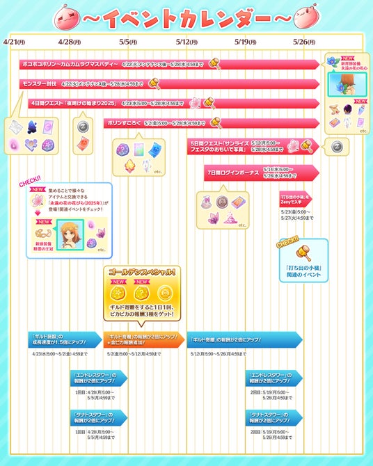 「カムカムラグマスバディ」イベントを開始いたしました。各イベントに参加するともらえる「永遠の花の花びら(2025年)」を集めると、新頭装備「精霊の王冠」などの豪華なアイテムと交換できます。「ポコポコポリン~カムカムラグマスバディ~」では新背部装備「永遠の花の花心」や「レリックピースストーン」「マステラの種」などを獲得できます。