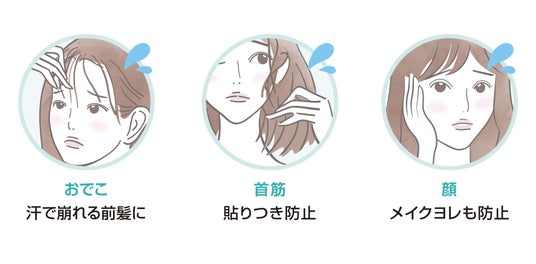 パフに適量を取り、おでこ、首筋、顔など汗が気になる部分に塗ってください。