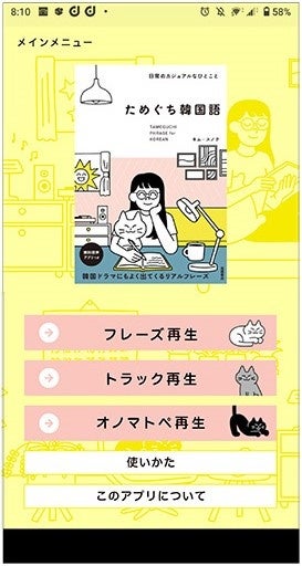 本書に収録されているフレーズとオノマトペクイズの音声は、専用のアプリで聞くことができます。聞き流しも可能で、日本語との韓国語の読み上げ順、再生速度、ポーズなど設定を自由に変更できます。