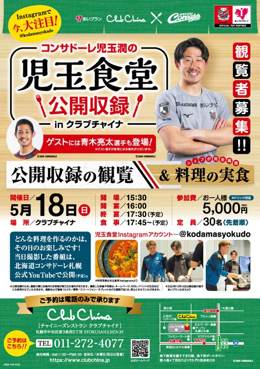 ご自身のInstagramで数々の手料理をご披露されている児玉選手が実際に調理する様子や、体づくりに配慮したこだわりのレシピを見られる「児玉食堂」は、北海道コンサドーレ札幌公式YouTubeで公開されているお料理コンテンツ。その様子を一足先にご覧いただける公開収録を、5月18日(日)にレストラン クラブチャイナで行います。