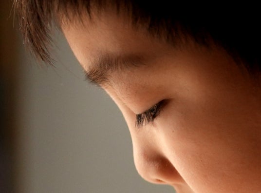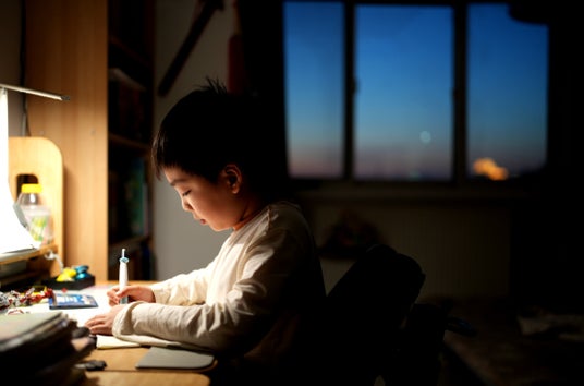 夕暮れ時の子供の宿題風景。画面の中心から約1/3離れた目の位置でも、まつ毛の一本一本の輪郭と肌の質感が鮮明に再現されています。