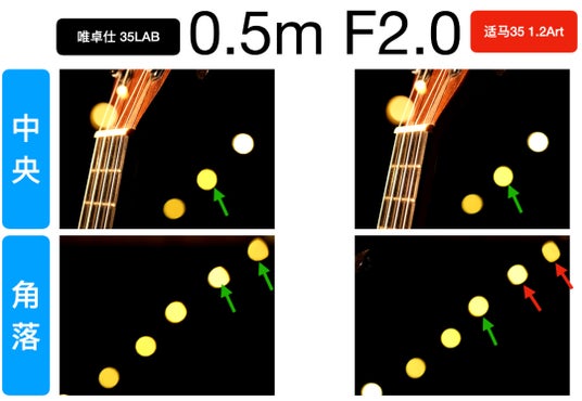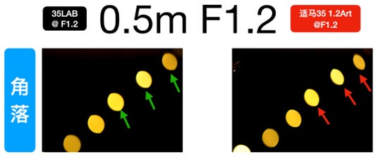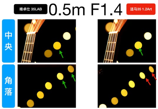 まず中央部からやや外れた位置に注目すると、シグマレンズの光斑がごくわずかながら円形度で優位性を示しています(比較画像中で緑矢印が指す2つの光斑)。