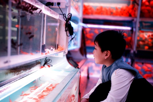 冬のジャケットから、初春の淡いピンク桜へ ,幻想的な金魚市場の光景、灯りに揺らぐ儚げな夜の情景