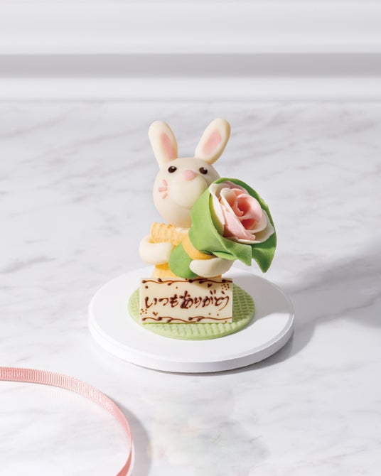 ウサギの女の子がお母さんへ、少し照れながら「ありがとう」の気持ちを込めてプレゼントを贈る様子を表現しました。すべてのパーツをお召し上がりいただけます。