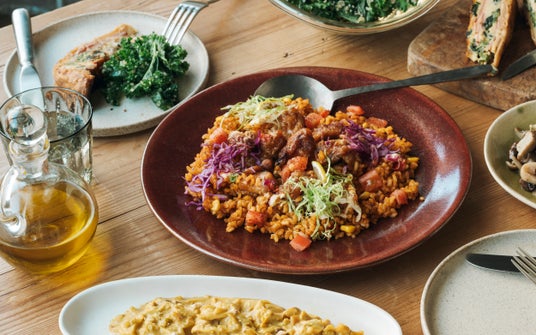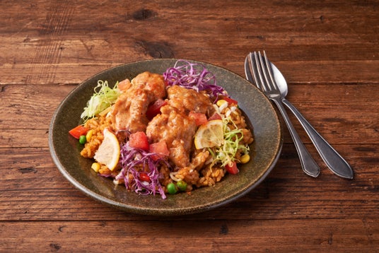 インドネシアの調味料・ケチャップマニスを使った甘めのソースを絡めた揚げ鶏に、チリパウダーやターメリックなどの香り豊かなスパイスを加えたライスがマッチ。DEAN & DELUCAの定番人気メニューです。