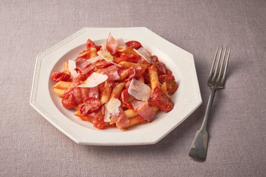 甘みと旨みを引き出したセミドライのミニトマトを、じっくりと炒めた玉ネギとベーコンが入ったトマトソースに加えました。風味豊かなソースがペンネによく絡む、満足感のあるパスタです。