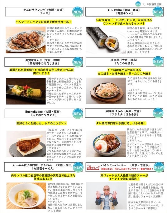 月に2万食以上売れるアサイーボウル「@atmark/アサイーカップ(大阪・心斎橋)」、ヘルシーなラムが女性にも大人気「ラムのラヴソング/ラム串(大阪・天満)」、新感覚の酢豚「蘭亭/蘭亭特製酢豚(大阪・本町)」、兵庫県但馬地方で年間80日限定営業の隠れ家ラーメン「いっせーのーで/とろとろ牛すじのニボ牛中華そば(兵庫・香美町)」など、はらぺこサーカス初登場の店舗が30店以上!