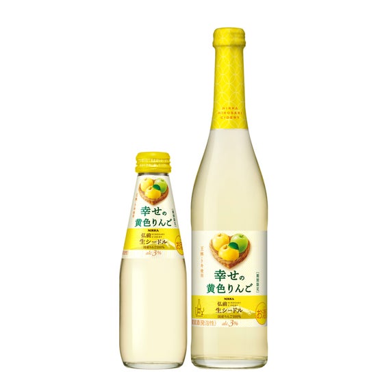 『ニッカ弘前 生シードル 幸せの黄色りんご』は、黄色系リンゴ品種「王林」「トキ」を使用したアルコール分3%のスパークリングワインです。さわやかな甘みと芳醇な香り、穏やかな酸味が特長です。使用品種の黄色系リンゴに合わせパッケージカラーを黄色で統一し、商品の持つ優しさや温かみを表現しています。黄色系リンゴ品種は、果実への日射を遮る葉を取り除く「葉摘み」や、着色が劣る部分に太陽光が当たるようにする「玉回し」といった作業が不要で、リンゴ農家の負担が少ないといわれています。本商品を通じてお客さまへ黄色系リンゴ品種の魅力を訴求し、リンゴ・シードル産業に関わる方の幸せを願い、商品名を「幸せの黄色りんご」としました。