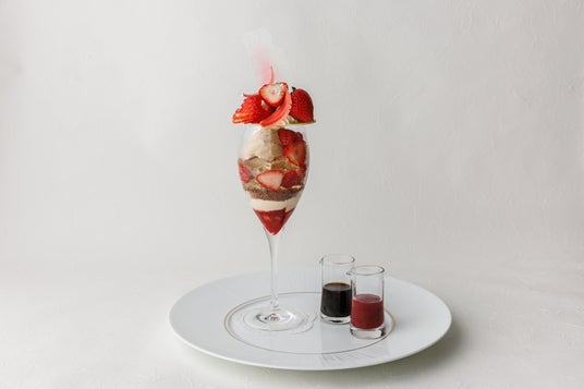 さらに、苺とジュニパーベリーを合わせたさわやかなソースと、ビターなアメリカーノのコク深いソースの2種類を用意。味わいを全体的に引き締めながらも印象的なアクセントを加えます。味わいが食べ進むごとに変化していくため、ゆったりとしたひとときにふさわしい、大人のための贅沢なデザートです。