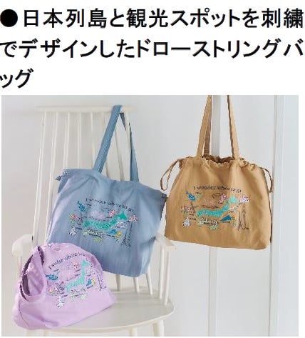 日本列島と10エリア(北海道、青森県、岩手県、新潟県、東京都、山梨県、広島県・愛媛県、長崎県、鹿児島県、沖縄県)の観光スポットのイラストを刺繍で表現。A4クリアファイルなどが入るドローストリングバッグです。色合いは、ラベンダー、ベージュ、ブルーの3色を展開。