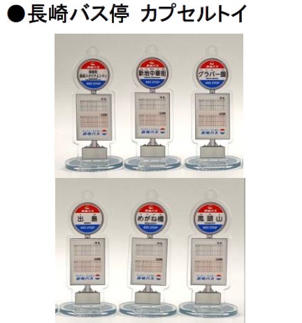 長崎の街中にある「新地中華街」や「出島」、「グラバー園」、「めがね橋」など、実在するバス停を手のひらサイズのアクリルスタンドキーホルダーとしてデザインし、展開。中身を見るのが楽しみになる人気のカプセルトイシリーズです。(長崎自動車商品化許諾済)