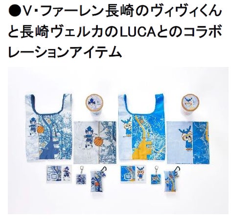 コンビニエコバッグ、フレーム付アクリルスタンド、2連アクリルキーホルダー、チャーム付クリアケース、ふた付2WAYタンブラー、ハンカチ等を展開。ヴィヴィくんとLUCAの背景には長崎の地図がデザインされています。コラボレーションアイテムを持って、試合観戦を楽しむことができます。