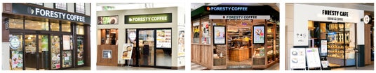 写真左から、フォレスティコーヒー(海老名店、相模大野店、町田店)、フォレスティカフェ 成城店
