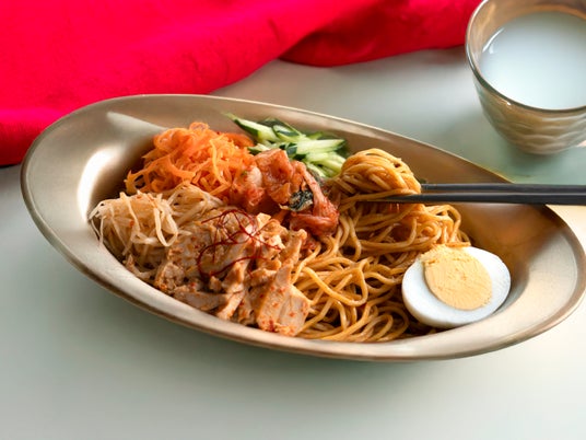 ビビン麺は、冷たくて辛味のある韓国の麺料理。味わいのベースとなるタレは、コチュジャンや醤油を使用したピリ辛でコクのある味わいに、隠し味のアップルビネガーを加えることで、フルーティーな酸味を利かせました。また、現地の飲食店で、鶏肉にコチュジャン・酢・マスタードをつける食べ方からヒントを得て、トッピングの蒸し鶏の味付けにもひと手間が。コチュジャンや韓国唐辛子などにマスタードを加えた自家製のヤンニョムを作り、蒸し鶏を和えることで、ほのかなアクセントを加えています。さらに、人参ともやしの自家製ナムル、きゅうり、ゆで玉子を添えました。自家製ナムルにもアップルビネガーを加えることで、一体感のある味わいに。のど越しの良い自家製の麺をタレや具材とよく絡めてお楽しみください。