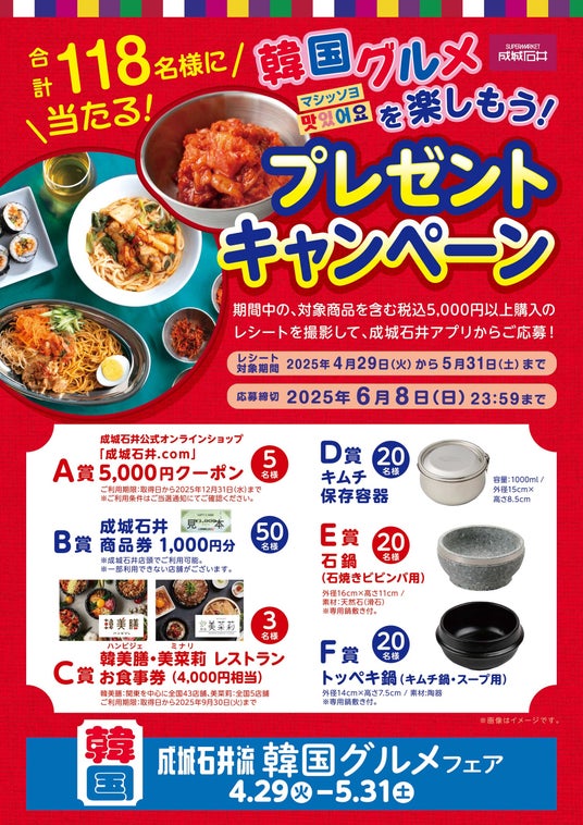 4月29日(火)から5月31日(土)までのフェア開催期間中、抽選で118名様に成城石井公式オンラインショップ「成城石井.com」で使えるクーポンや韓国料理店のお食事券などが当たるプレゼントキャンペーンを実施いたします。成城石井公式アプリの応募フォームより、「成城石井流 韓国グルメフェア」対象商品を含む税込み5,000円以上をご購入いただいたレシートをご撮影・登録していただくことでご応募いただけます。ぜひこの機会に韓国グルメをお楽しみください。