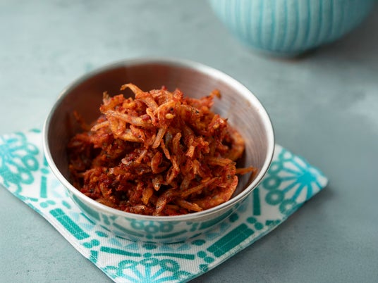 現地のパンチャンの食材として親しまれているちりめん。日本でも馴染みの食材であることから、キムチとして商品化。味わいが単調にならないように、バイヤーのひと工夫でちりめんと干しえびを組み合わせました。原材料の選定にこだわり、瀬戸内海産の天日干しされたちりめんと、三陸産の素干し花小えびを使用しています。ヤンニャムは辛味だけではなく昆布や海老の出汁を利かせることで、ちりめんと干しえびの旨みを引き出しています。ご飯のお供としてお召し上がりいただくのはもちろんのこと、そのままお酒のおつまみに、冷奴やサラダのトッピングに、と様々な食べ方をお楽しみいただけます。
