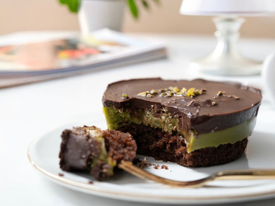 現地視察で出会った「ドバイチョコ」の進化系スイーツを参考に、セントラルキッチンのパティシエがケーキとしてアレンジしました。チョコパウンド生地の上にピスタチオチョコ生地を重ね、カダイフをのせた後にコーティングのチョコを重ねた3層構造に仕立てています。ドバイチョコならではのパリパリとした食感を再現するために、カダイフは、セントラルキッチンで細かく砕いたものをバターと絡めてからロースト。その後にホワイトチョコでコーティングするというひと手間を加えています。ピスタチオのしっかりとした風味とチョコのコクや重厚感が織り成すハーモニーをお楽しみいただける一品です。