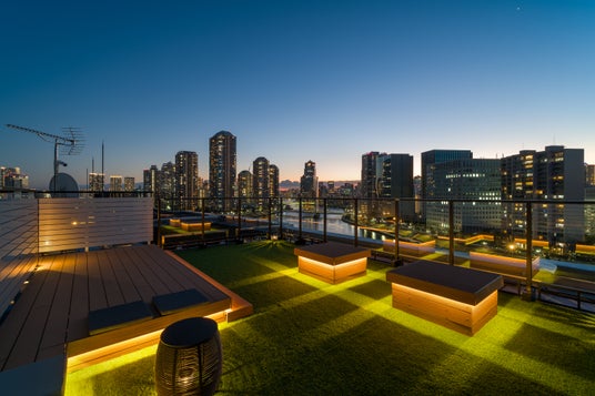 屋上には、ウッドデッキと人工芝を設えた、隅田川や都心の景色を望むテラスを設置。夜は間接照明により昼間とは違った雰囲気となり、サードプレイスとしてお使いいただけます。