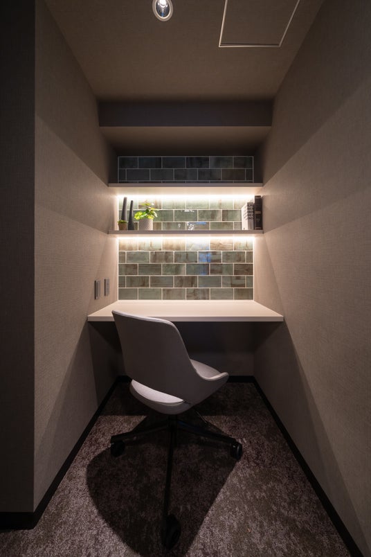 2階には、法人登記可能で、無料Wi-Fiを利用できる入居者専用のビジネスラウンジを設置しました。2ヶ所設置した個室ブースは個別空調も完備しており、リモートワーク時のWEB会議や集中したい作業、読書など様々な用途にお使いいただけます。また、プロジェクターとホワイトボード完備のミーティングルームを設け、事前予約により貸切で利用することも可能です。