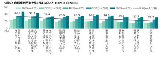 自転車利用者を見て気になることは、「信号や交通ルールを守らない」「スマホをみながら走行」が3割台で上位。