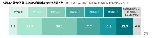 徒歩何分以上なら自転車を使うかを聴取したところ、「10分以上」が26.1%で最多。<図3>