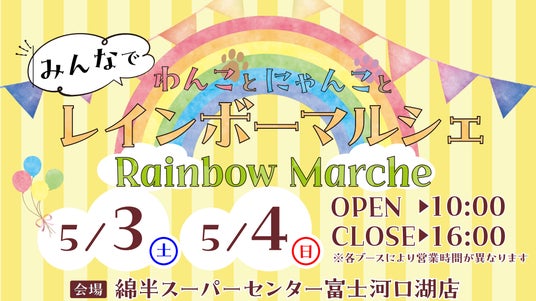 株式会社綿半ホームエイド(長野県長野市 代表取締役社長:牧島禎彦)は、2025年5月3日(土)・4日(日)綿半スーパーセンター富士河口湖店にてRainbowマルシェとタッグを組み、「わんことにゃんことみんなでRainbowマルシェ」を開催いたします。