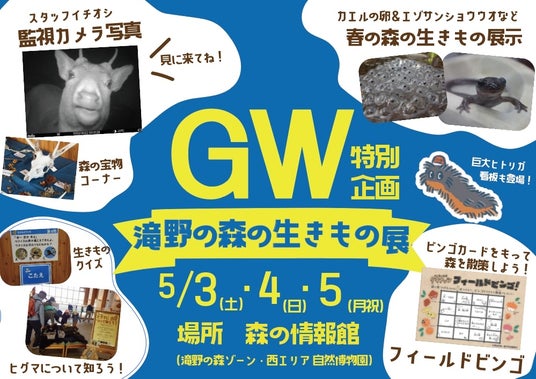 GW連休期間中の滝野公園では、自然を満喫できる生きもの探しや生きもの展、クラフト体験教室など子供はもちろん大人の方も楽しめるGW限定イベントを開催します。