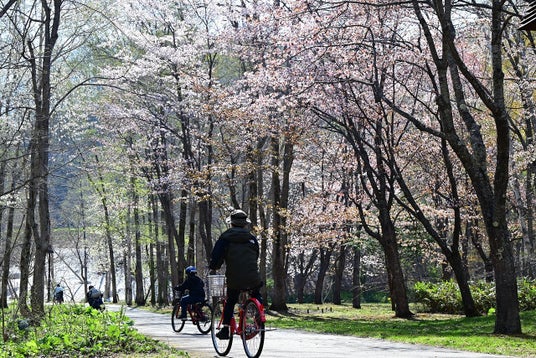 サイクリングを楽しみながら鑑賞できるサクラをはじめ、カタクリやフクジュソウなどの花々を楽しめます。