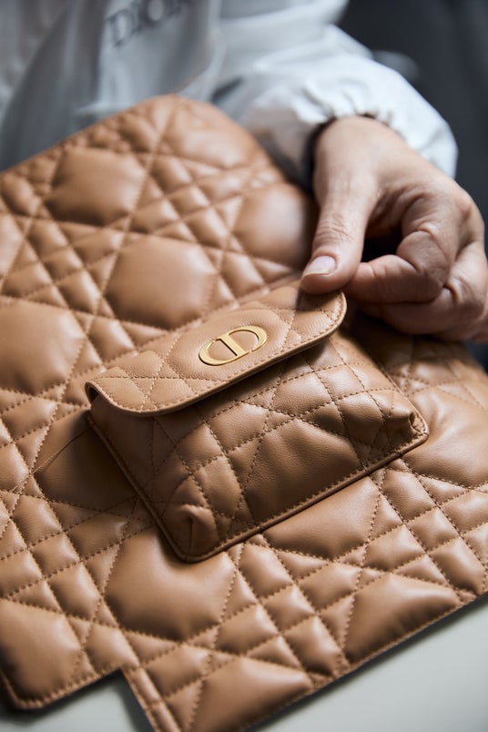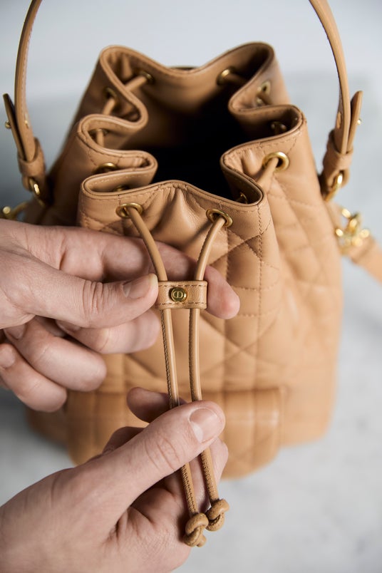 クリスチャン・ディオールの妹、カトリーヌに捧げるオマージュとして展開されている「ディオール カロ」シリーズに2025年フォール コレクションより新たに「バケット」バッグが加わりました。「マクロカナージュ」のグラフィカルなラインによって昇華された、ライトゴールドのプレシャスなレザーを使用し、しなやかな曲線を描く羨望のアイテムは卓越したサヴォワールフェールの結晶です。制作の各段階においてスケッチからアイレットの配置、なめし加工や組み立てに至るまで、限りなく細心の注意が込められると同時に革新的な技術が要求されます。創設者クチュリエが大切にしてきたディテールの芸術へのオマージュとして、ドローストリングとフロントポケットを飾る"CD"イニシャルなど、繊細なゴールドの仕上げがこの特別な作品にエレガンスを添え、パウダーピンク、ブラック、ラテ ディオール、そしてナチュラルなラフィアバージョンなど、さまざまなカラーバリエーションが展開されます。ディオール スタイルの現代性とアトリエの卓越性を融合させたこの特別なバッグは、全国のディオール ブティックおよび、公式オンラインブティックでご覧いただけます