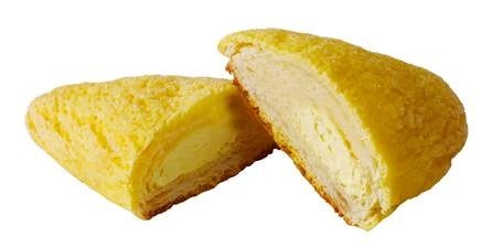 レモン果汁入りのクッキー生地をのせ、レモン風味ホイップを入れたデニッシュメロンパンです。